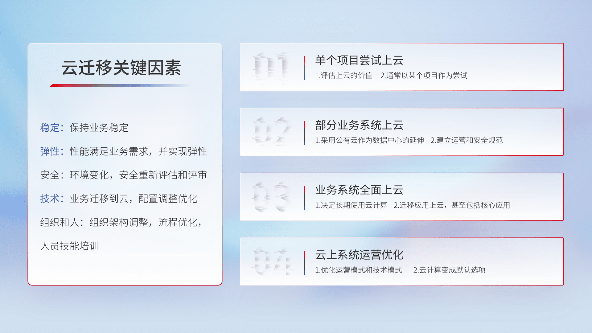 结合实际业务,,,,从规划设计、、、云平台选型、、、云原生改造、、、数据迁移、、、、集成交付,,,迁移全过程为客户识别最佳上云路径,,,做好风险识别管理,,,设计网络架构、、、、身份权限、、安全审计合规、、操作审计、、、、日志审计、、监控告警策略、、、、多站点容灾设计等,,,对云上基础设施进行整体规划,,提升IT治理水平,,,以满足弹性、、、、高可用、、、、高性能的需求。。。。