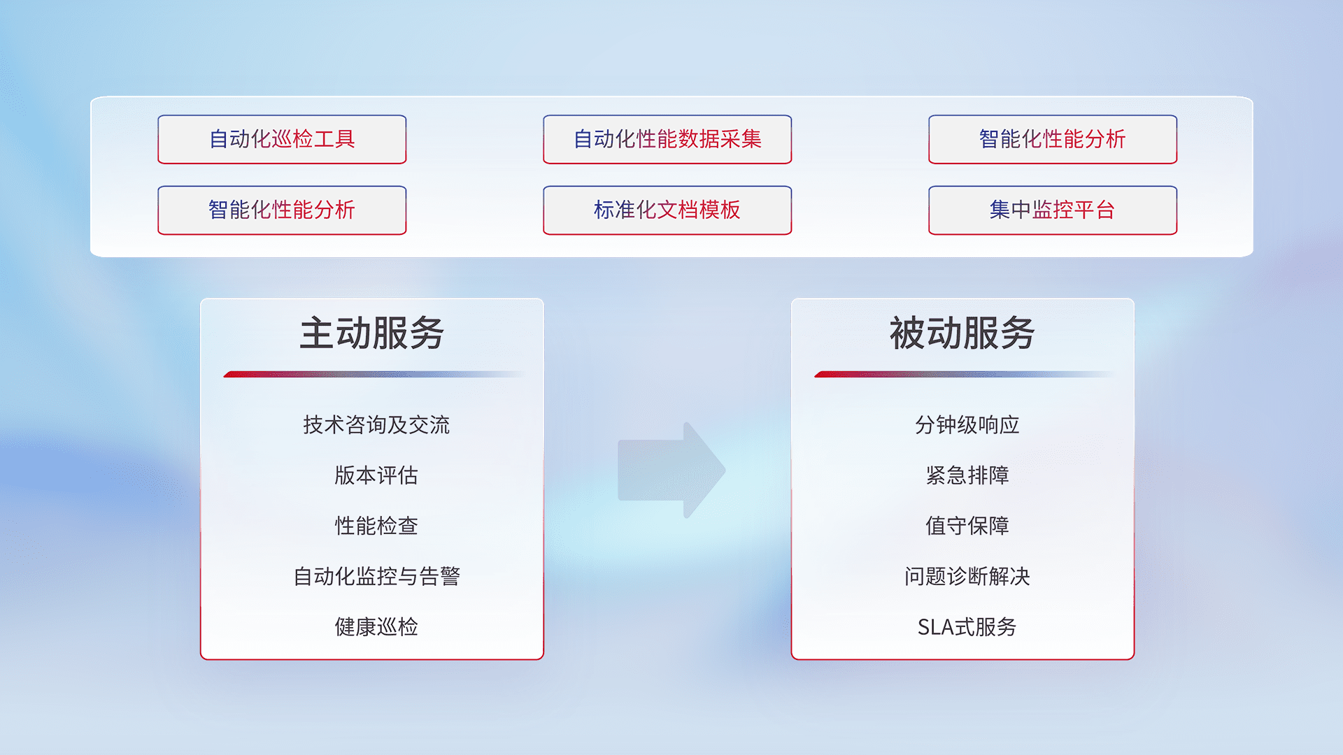 智能化工具和标准化文档,,保障服务质量,,,提供主动服务(包含技术咨询、、、版本评估、、性能检查、、自动化监控与告警、、、、健康巡检)和被动服务包含(分钟级响应、、、、紧急排障、、、值守保障、、、、问题诊断解决、、、、SLA服务)。。